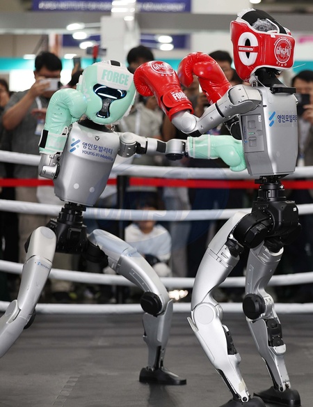 Humanoid robots fight in kickboxing competition Two humanoid G1 robots, developed by China's Unitree Robotics, trade punches in a kickboxing competition during an international robot expo at the EXCO convention center in the southeastern city of Daegu on Oct. 22, 2025., Credit:Yonhap News / Avalon