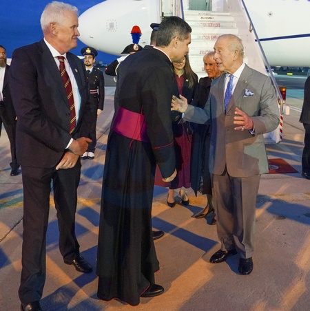 NG ARRIVED ROMR 01.The King and Queen arrive in Rome to undertake an historic State Visit to the Holy See Their Majesties will join His Holiness Pope Leo XIV to celebrate the 2025 Jubilee year. Traditionally marked every 25 years, the Jubilee is a special time for the Catholic Church. Picture Arthur Edwards.The King meets Monsignor Javier Domingo Fernández.González; and Retired Apostolic Nuncio, Archbishop Francesco Canalini...., Credit:Arthur Edwards / Avalon