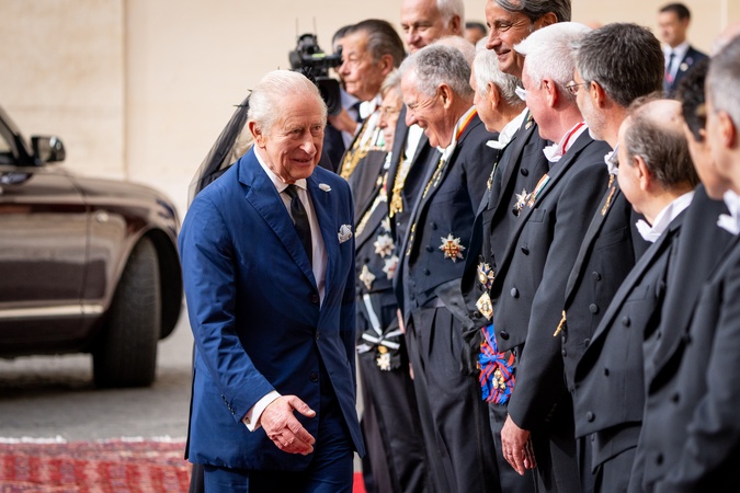 Britain's King Charles III and Queen Camilla arrive in the St. Damasus Courtyard at the Vatican for a state visit, where they will meet with Pope Leo XIV in Vatican City, Vatican, on 23 October 2025.