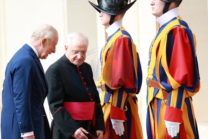 October 23, 2025, Vatican City. San Damaso Courtyard. Arrival of King Charles III of England with Queen Camilla for the meeting with the Pope. Pictured: King Charles III of England with Queen Camilla welcomed by Monsignor Leonardo Sapienza and the gentlemen of His Holiness., Credit:Maria Laura Antonelli / Avalon