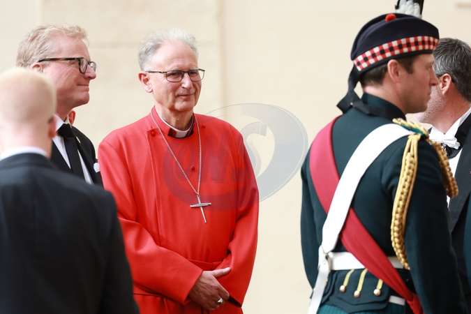 October 23, 2025, Vatican City. San Damaso Courtyard. Arrival of King Charles III of England with Queen Camilla for the meeting with the Pope. Pictured: King Charles III of England with Queen Camilla welcomed by Monsignor Leonardo Sapienza and the gentlemen of His Holiness., Credit:Maria Laura Antonelli / Avalon