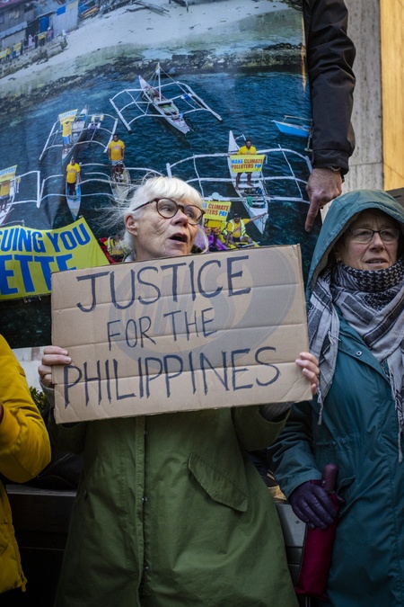 Environmental and climate justice activists gathered outside Shell's Global Headquarters in Central London ahead of the company's upcoming "Profits Day.” Demonstrators called on Shell to pay reparations to survivors of Typhoon Odette in the Philippines, accusing the oil giant of profiting from climate destruction. Protesters held banners and placards demanding accountability from major polluters., Credit:Zak Irfan / Avalon