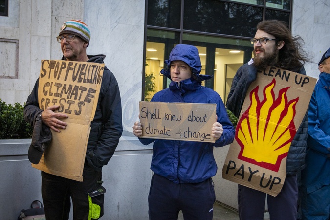 Environmental and climate justice activists gathered outside Shell's Global Headquarters in Central London ahead of the company's upcoming "Profits Day.” Demonstrators called on Shell to pay reparations to survivors of Typhoon Odette in the Philippines, accusing the oil giant of profiting from climate destruction. Protesters held banners and placards demanding accountability from major polluters., Credit:Zak Irfan / Avalon