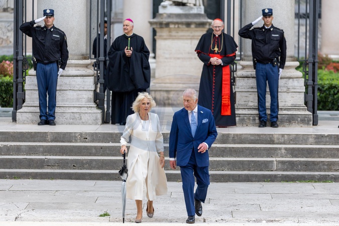 King Charles III and Queen Camilla visit the Papal Basilica and Abbey of St. Paul's Outside the Walls to attend an ecumenical service in recognition of His Majesty becoming 'Royal Confrater' of the Abbey of St Paul's. The Children of the Choir of His Majesty's Chapel Royal and the Choir of St. George's Chapel, Windsor, will perform. Rome, Italy 23 Oct 2025, Credit:Daniel Ibanez / Avalon