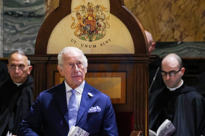 King Charles III and Queen Camilla visit the Papal Basilica and Abbey of St. Paul's Outside the Walls to attend an ecumenical service in recognition of His Majesty becoming 'Royal Confrater' of the Abbey of St Paul's. The Children of the Choir of His Majesty's Chapel Royal and the Choir of St. George's Chapel, Windsor, will perform. Rome, Italy 23 Oct 2025 *** Local Caption *** ROME, I - OCTOBER 23: King Charles III and Queen Camilla leave St. Paul Basilica after an ecumenical Service of Prayer on October 23, 2025 in Rome, Italy. During this historic State Visit, King Charles III and Queen Camilla will meet Pope Leo XIV for the first time since he was elected in May 2025. The King and Queen will join the Catholic Church's 2025 Jubilee Year celebrations, during which the heads of the Catholic Church and Church of England will pray together, the first time the British monarch and pontiff have done so at a church service since the English Reformation. (Photo by Franco Origlia/Getty Images), Credit:Franco Origlia / Avalon