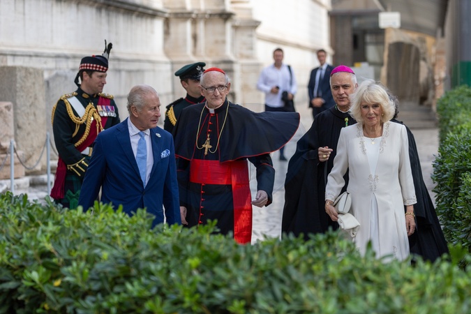 King Charles III and Queen Camilla visit the Papal Basilica and Abbey of St. Paul's Outside the Walls to attend an ecumenical service in recognition of His Majesty becoming 'Royal Confrater' of the Abbey of St Paul's. The Children of the Choir of His Majesty's Chapel Royal and the Choir of St. George's Chapel, Windsor, will perform. Rome, Italy 23 Oct 2025, Credit:Daniel Ibanez / Avalon