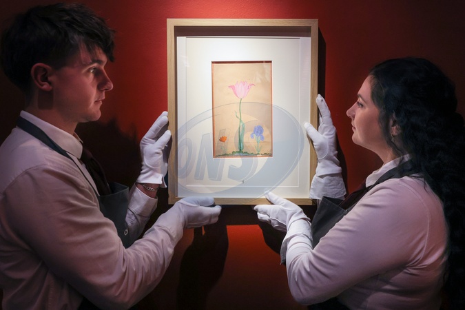 London, UK. 24th Oct 2025. Staff with 'Tulips and an Iris', Mughal India, circa 1640-50. Estimate £100,000-150,000. Christie's Exceptional Paintings from The Personal Collection of Prince & Princess Sadruddin Aga Khan photocall., Credit:Imageplotter / Avalon