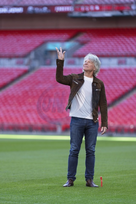 Jon Bon Jovi poses for photos on the pitch after a press conference at Wembley Stadium, in London, UK, on 24th October 2025, Credit:James Shaw / Avalon