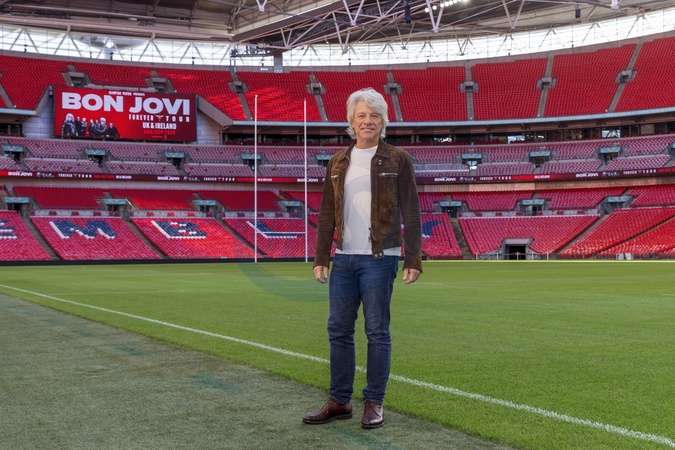 Jon Bon Jovi poses for photos on the pitch after a press conference at Wembley Stadium, in London, UK, on 24th October 2025, Credit:James Shaw / Avalon