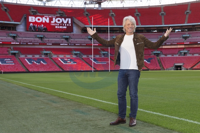 Jon Bon Jovi poses for photos on the pitch after a press conference at Wembley Stadium, in London, UK, on 24th October 2025, Credit:James Shaw / Avalon