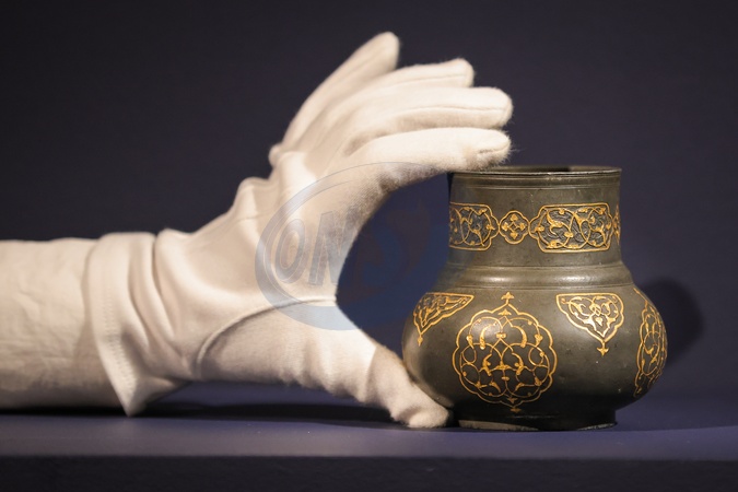 London, UK. 24th Oct 2025. Staff with 'An early Safavid gold inlaid zinc tankard (mashrabe/masrapa), Tabriz, North West Iran, Period of Shah Isma'il I (1501-1527), estimate: £1,500,000-1,800,000'. Christie's Art of the Islamic and Indian Worlds photocall., Credit:Imageplotter / Avalon