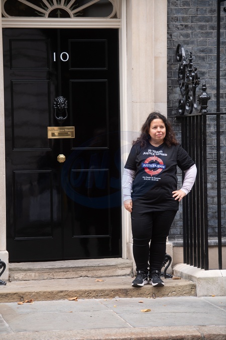 Patricia da Silva Armani - cousin of Brazilian Jean Charles de Menezes from The United Friends and Family Campaign poses outside of Downing Street, London, England, UK on Saturday 25 October, 2025 after delivering a petition to demand accountability and urgent reform over the deaths of their loved ones., Credit:Justin Ng / Avalon