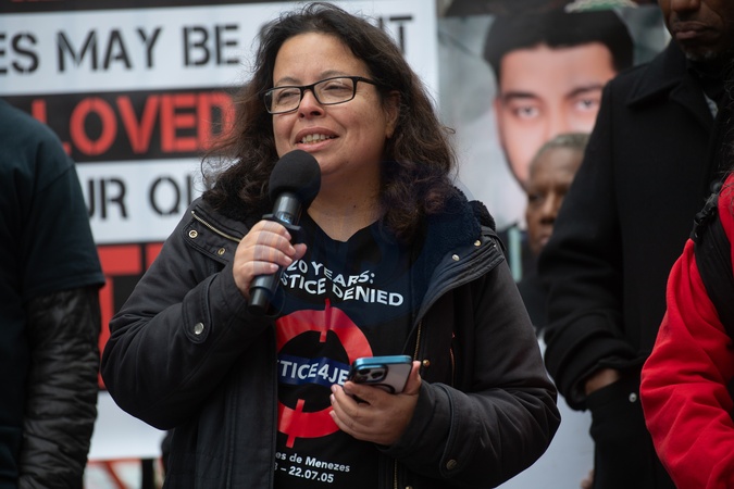 Patricia da Silva Armani - cousin of Brazilian Jean Charles de Menezes from The United Friends and Family Campaign speak outside of Downing Street, London, England, UK on Saturday 25 October, 2025 as part of an Annual Memorial Procession., Credit:Justin Ng / Avalon