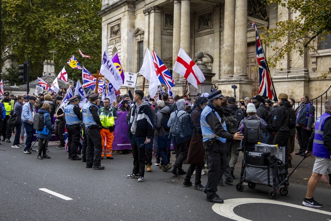 UKIP supporters gathered outside the London Oratory in South Kensington before marching to Speakers' Corner in Hyde Park for a political rally. The demonstration drew hundreds of attendees carrying party flags and banners promoting nationalist and anti-immigration messages. A strong police presence escorted the march to maintain order and prevent clashes with counter-protesters. The rally concluded with speeches from organisers and supporters at Speakers' Corner., Credit:Zak Irfan / Avalon