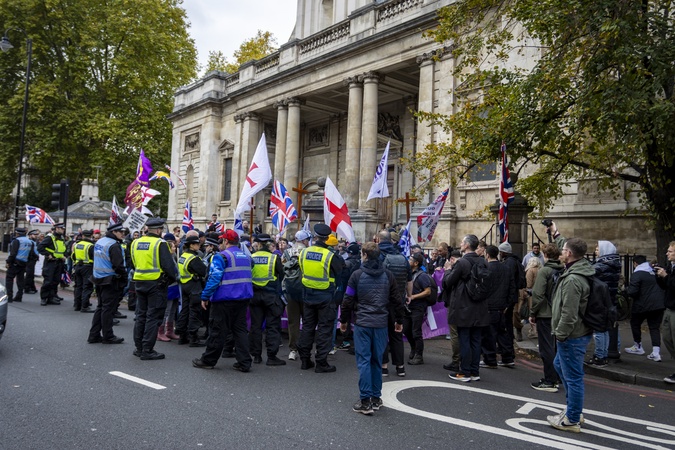 UKIP supporters gathered outside the London Oratory in South Kensington before marching to Speakers' Corner in Hyde Park for a political rally. The demonstration drew hundreds of attendees carrying party flags and banners promoting nationalist and anti-immigration messages. A strong police presence escorted the march to maintain order and prevent clashes with counter-protesters. The rally concluded with speeches from organisers and supporters at Speakers' Corner., Credit:Zak Irfan / Avalon