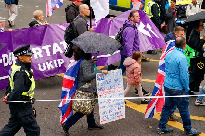 UKIP protest was planned in Whitechapel. Met police placed condition not allowing UKIP to protest in Tower Hamlets. UKIP moved to muster at London Oratory with march to Marble Arch. Met police set conditions to stop SUTR etc forming up anywhere near to the UKIP protest., Credit:Aldo Ciarrocchi / Avalon