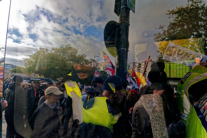 UKIP protest was planned in Whitechapel. Met police placed condition not allowing UKIP to protest in Tower Hamlets. UKIP moved to muster at London Oratory with march to Marble Arch. Met police set conditions to stop SUTR etc forming up anywhere near to the UKIP protest., Credit:Aldo Ciarrocchi / Avalon