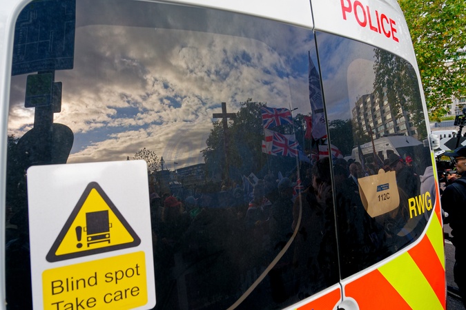 UKIP protest was planned in Whitechapel. Met police placed condition not allowing UKIP to protest in Tower Hamlets. UKIP moved to muster at London Oratory with march to Marble Arch. Met police set conditions to stop SUTR etc forming up anywhere near to the UKIP protest., Credit:Aldo Ciarrocchi / Avalon