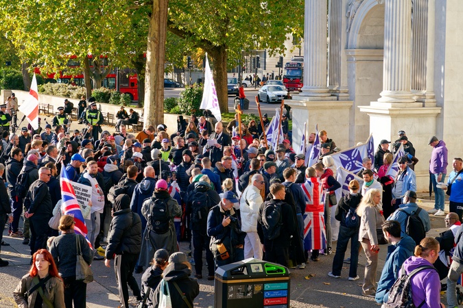 UKIP protest was planned in Whitechapel. Met police placed condition not allowing UKIP to protest in Tower Hamlets. UKIP moved to muster at London Oratory with march to Marble Arch. Met police set conditions to stop SUTR etc forming up anywhere near to the UKIP protest., Credit:Aldo Ciarrocchi / Avalon