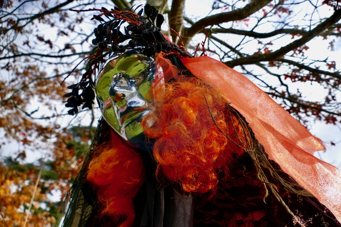 Characters on the Halloween trail. Friends of Caversham Court created a Halloween trail all made from recyclable materials placed around the picturesque Grade II listed grounds on the banks of the River Thames. Ghosts, witches, owls, goblins, Guy Fawkes and Cruella Deville complete with a Dalmation in her hand bag were on display to celebrate Halloween.Caversham Court garden is of national importance and listed in the English Heritage 'Register of English Parks and Gardens ' of special historic interest in England'., Credit:Geoffrey Swaine / Avalon