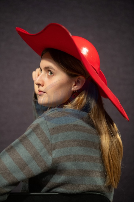 A staff member views 'Kylie Jenner: A stylised red leather hat', designed by Cecilio Castrillo (est. £1.5k - £2k) which is on auction at Bonhams 'The Uncanny' online Sale until 29 October 2025 at Bonhams in London, England, UK on Monday 27 October, 2025., Credit:Justin Ng / Avalon