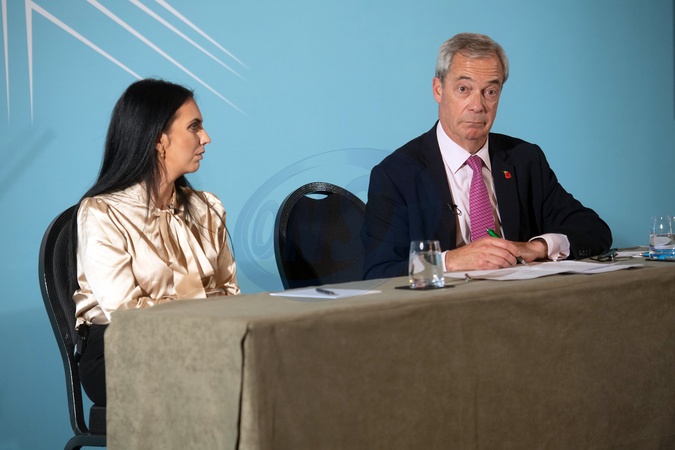 Reform UK Leader Nigel Farage and Ellie-Ann Reynolds - a child sexual abuse survivor (and who resigned from The national grooming gangs inquiry). speaks at a Reform UK Press Conference on Grooming Gangs at The Royal Horseguards Hotel in London, England, UK on Monday 27 October, 2025., Credit:Justin Ng / Avalon