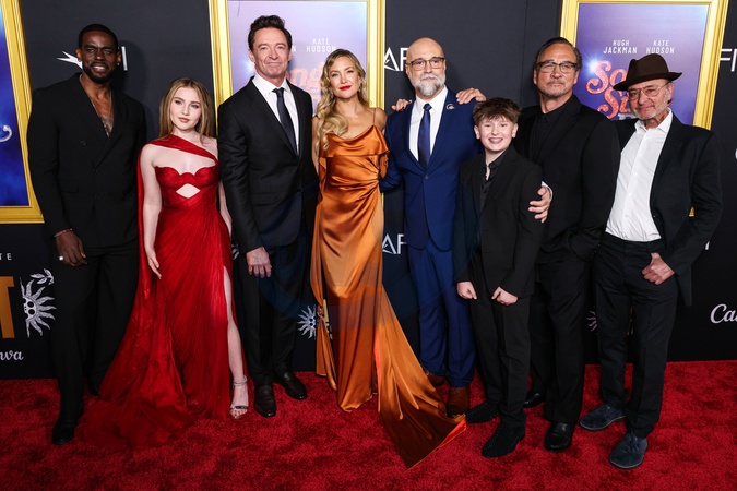 HOLLYWOOD, LOS ANGELES, CALIFORNIA, USA - OCTOBER 26: American actor Mustafa Shakir, American actress Ella Anderson, Australian actor, singer, and producer Hugh Jackman, American actress, producer, director, and entrepreneur Kate Hudson, Craig Brewer, Hudson Hensley, American actor, comedian, producer, writer, and director Jim Belushi, American actor, director, producer, writer, and activist Fisher Stevens arrive at the 2025 AFI (American Film Institute) Fest Presented By Canva - Closing Night Gala Premiere Of Focus Features' 'Song Sung Blue' held at the TCL Chinese Theatre IMAX on October 26, 2025 in Hollywood, Los Angeles, California, United States., Credit:Xavier Collin / Avalon