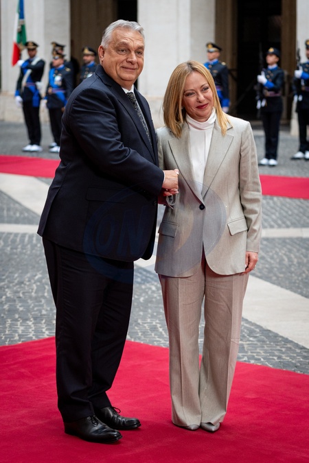 Italian Prime Minister Giorgia Meloni receives the Prime Minister of Hungary, Viktor Orbán at Palazzo Chigi in Rome, Italy on 27 October 2025.
