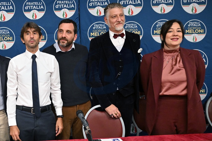 October 25, 2025, Prato, Fratelli d'Italia initiative to celebrate three years of the Meloni government. Pictured are the Minister of Culture, Alessandro Giuli, Giovanni Donzelli, Alessandro Tomasi, Mayor of Pistoia, and Chiara La Porta., Credit:Aleandro Biagianti / Avalon