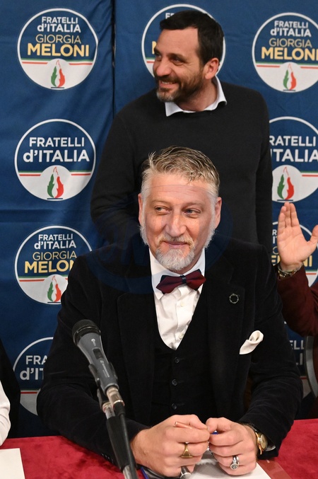 October 25, 2025, Prato, Brothers of Italy initiative to celebrate three years of the Meloni government. Pictured is Minister Alessandro Giuli with Alessandro Tomasi, mayor of Pistoia., Credit:Aleandro Biagianti / Avalon