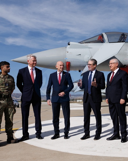 27/10/2025. Ankara, Türkiye. Prime Minister Keir Starmer meets Typhoon pilots and engineers alongside Defence Secretary John Healey, Türkiye's Minister of National Defence Yaşar Güler and Türkiye's Garrison Commander Tümgeneral Ahmet Kurumahmut as Türkiye buys 20 UK Typhoon fighter jets securing 20,000 UK jobs., Credit:Lauren Hurley / Avalon