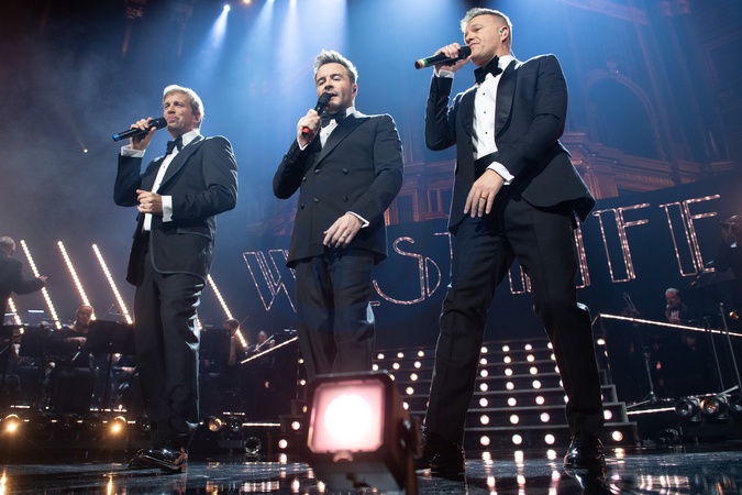 (L-R) - Kian Egan, Shane Filan and Nicky Byrne of Irish pop band Westlife perform with the Royal Philharmonic Concert Orchestra, at Royal Albert Hall, London, England, UK on Monday 27 October 2025 as part of Their 25th Anniversary World Tour., Credit:Justin Ng / Avalon