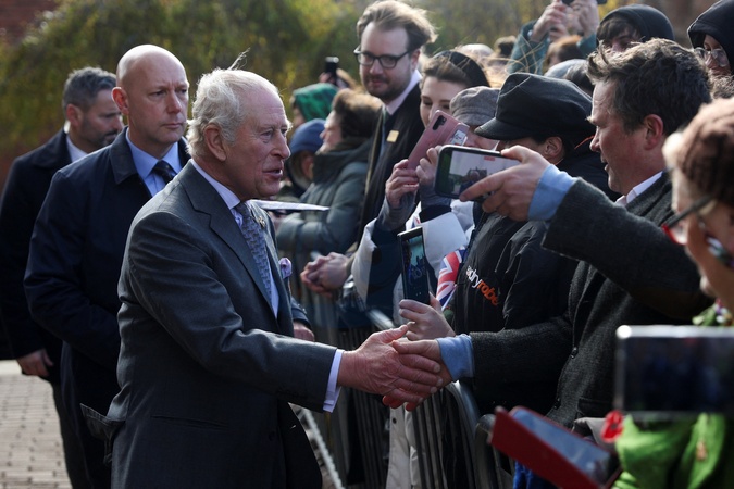Britain's King Charles interacts shakes hands with a man as he arrives at Lichfield Cathedral, to celebrate the local community and heritage skills, with a focus on the Fenland Black Oak Table, The Table for the Nation, in Lichfield, Staffordshire, Britain October 27, 2025. REUTERS/Temilade, Credit:Temilade Adelaja / Avalon