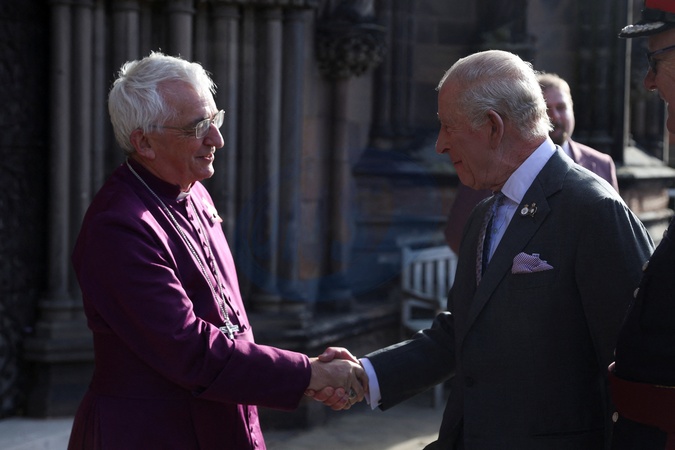 Britain's King Charles shakes hands with Bishop of Lichfield, Right Reverend Michael Ipgrave, as he arrives at Lichfield Cathedral, to celebrate the local community and heritage skills, with a focus on the Fenland Black Oak Table, The Table for the Nation, in Lichfield, Staffordshire, Britain October 27, 2025. REUTERS/Temilade, Credit:Temilade Adelaja / Avalon