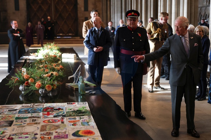 Britain's King Charles points at The Table for the Nation positioned in the Nave of Lichfield Cathedral and crafted from 5,000-year-old Fenland Black Oak, in Lichfield, Staffordshire, Britain October 27, 2025. REUTERS/Temilade, Credit:Temilade Adelaja / Avalon