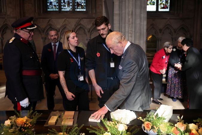 Britain's King Charles stands next to The Table for the Nation positioned in the Nave of Lichfield Cathedral and crafted from 5,000-year-old Fenland Black Oak, in Lichfield, Staffordshire, Britain October 27, 2025. REUTERS/Temilade, Credit:Temilade Adelaja / Avalon