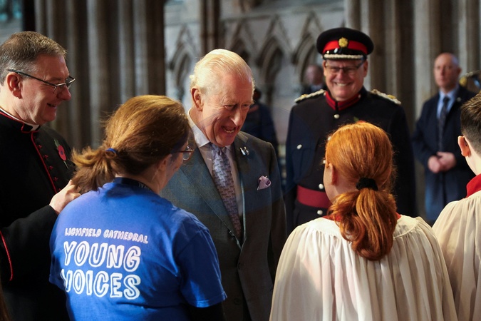 Britain's King Charles reacts as he meets community groups during his visit at Lichfield Cathedral, with a focus on the Fenland Black Oak Table, The Table for the Nation, in Lichfield, Staffordshire, Britain October 27, 2025. REUTERS/Temilade, Credit:Temilade Adelaja / Avalon