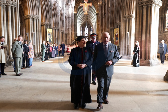 Britain's King Charles walks with Dean of Lichfield Cathedral, Right Reverend Janet McFarlane, as he visits the Lichfield Cathedral, to celebrate the local community and heritage skills, with a focus on the Fenland Black Oak Table, The Table for the Nation, in Lichfield, Staffordshire, Britain October 27, 2025. REUTERS/Temilade, Credit:Temilade Adelaja / Avalon