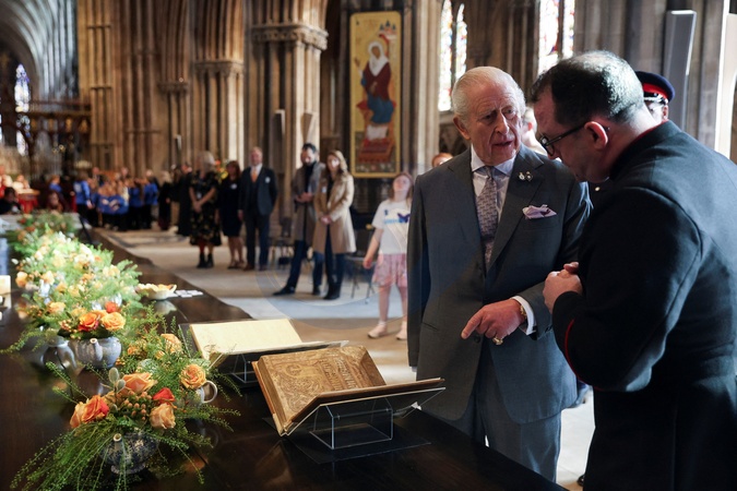 Britain's King Charles stands next to The Table for the Nation positioned in the Nave of Lichfield Cathedral and crafted from 5,000-year-old Fenland Black Oak, in Lichfield, Staffordshire, Britain October 27, 2025. REUTERS/Temilade, Credit:Temilade Adelaja / Avalon
