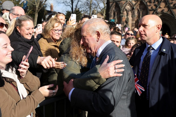 Britain's King Charles embraces a person following his visit to the Lichfield Cathedral, in Lichfield, Staffordshire, Britain, October 27, 2025. REUTERS/Temilade, Credit:Temilade Adelaja / Avalon
