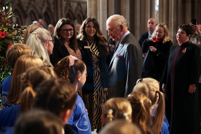 Britain's King Charles meets community groups during his visit at Lichfield Cathedral, with a focus on the Fenland Black Oak Table, The Table for the Nation, in Lichfield, Staffordshire, Britain October 27, 2025. REUTERS/Temilade, Credit:Temilade Adelaja / Avalon