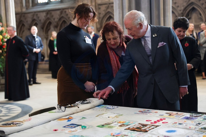 Britain's King Charles looks at Common Threads on the Table for the Nation positioned in the Nave of Lichfield Cathedral and crafted from 5,000-year-old Fenland Black Oak, in Lichfield, Staffordshire, Britain October 27, 2025. REUTERS/Temilade, Credit:Temilade Adelaja / Avalon