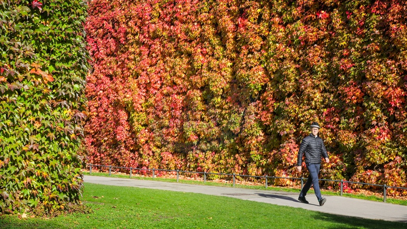 London, UK. 28th Oct 2025. People walk and cycle by the vibrantly coloured autumnal virginia creeper (Parthenocissus quinquefolia) growing along the walls of the Admiralty Citadel building at Horse Guards Parade in Westminster, on a day with beautiful sunshine and mild temperatures., Credit:Imageplotter / Avalon