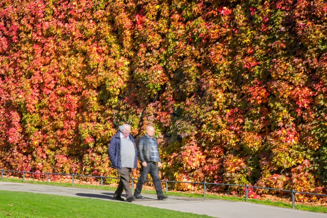 London, UK. 28th Oct 2025. People walk and cycle by the vibrantly coloured autumnal virginia creeper (Parthenocissus quinquefolia) growing along the walls of the Admiralty Citadel building at Horse Guards Parade in Westminster, on a day with beautiful sunshine and mild temperatures., Credit:Imageplotter / Avalon