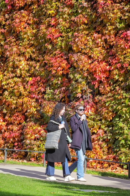 London, UK. 28th Oct 2025. People walk and cycle by the vibrantly coloured autumnal virginia creeper (Parthenocissus quinquefolia) growing along the walls of the Admiralty Citadel building at Horse Guards Parade in Westminster, on a day with beautiful sunshine and mild temperatures., Credit:Imageplotter / Avalon