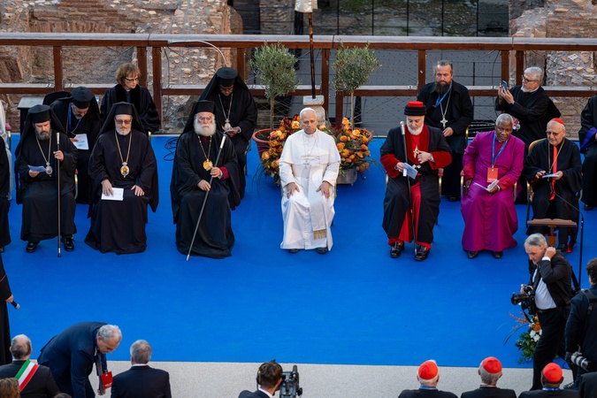 Pope Leo XIV attends an inter-religious meeting to pray for peace inside the Colosseum in Rome, Italy on 28 October 2025.