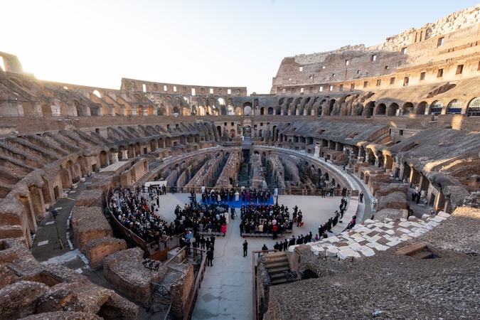 Pope Leo XIV attends an inter-religious meeting to pray for peace inside the Colosseum in Rome, Italy on 28 October 2025.