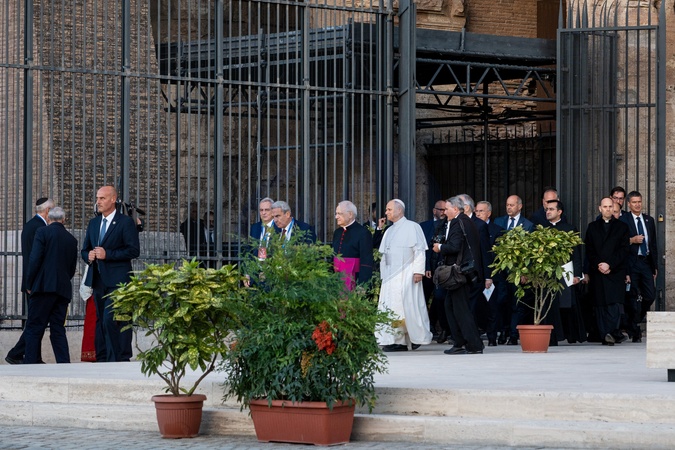 Pope Leo XIV attends an inter-religious meeting to pray for peace inside the Colosseum in Rome, Italy on 28 October 2025.