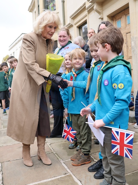 CORSHAM, ENGLAND - OCTOBER 28: Queen Camilla meets young well-wishers ahead of her visit to The Poppy Project on October 28, 2025 in Corsham, England. The Poppy Project has resulted in a display of crocheted and knitted poppies, which commemorates the 80th anniversary of the end of World War II., Credit:Chris Jackson / Avalon