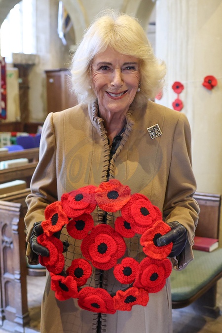 CORSHAM, ENGLAND - OCTOBER 28: Queen Camilla smiles as she holds a wreath inside St. Bartholomew's Church during her visit to The Poppy Project on October 28, 2025 in Corsham, England. The Poppy Project has resulted in a display of crocheted and knitted poppies, which commemorates the 80th anniversary of the end of World War II., Credit:Chris Jackson / Avalon